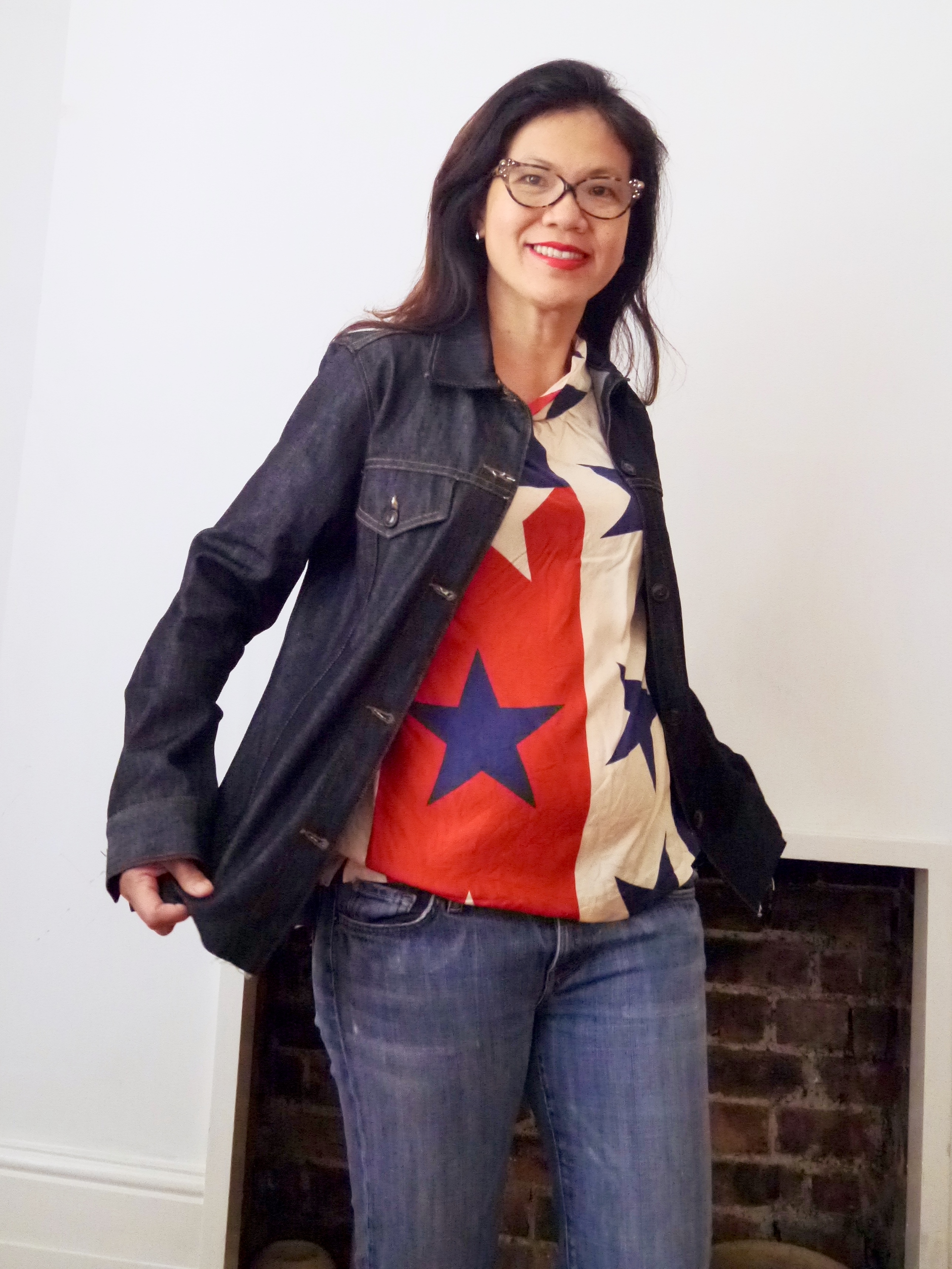 I take the blouses and skirt Mono print on fabric that I make in the summer into in between season (trans-seasonal) wearable outfits. I wear the look for leisure (school runs) or leisure work clothes.