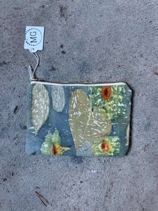 This is a botanical printed leather purse with cotton as lining. I have used 100% leather as the outer layer as it fibre that will absorb natural dyes and print from foliage and flowers very well. It will age well with time if care is given like leather polish or keeping from dampness