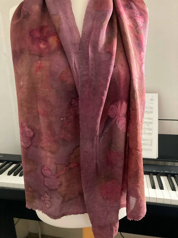 This is a botanical silk scarf natural printed 100% silk habotai scarf made with lots of care and time using all-natural dyes. The leaves are foraged and then printed locally. Each piece is produced with a lot of love and can take up to 3 days from the start to finish. Scouring, mordanting, and preparing the dyes out of dried powdered/ chipped barks. Dyeing and printing after which is it washed and ironed.