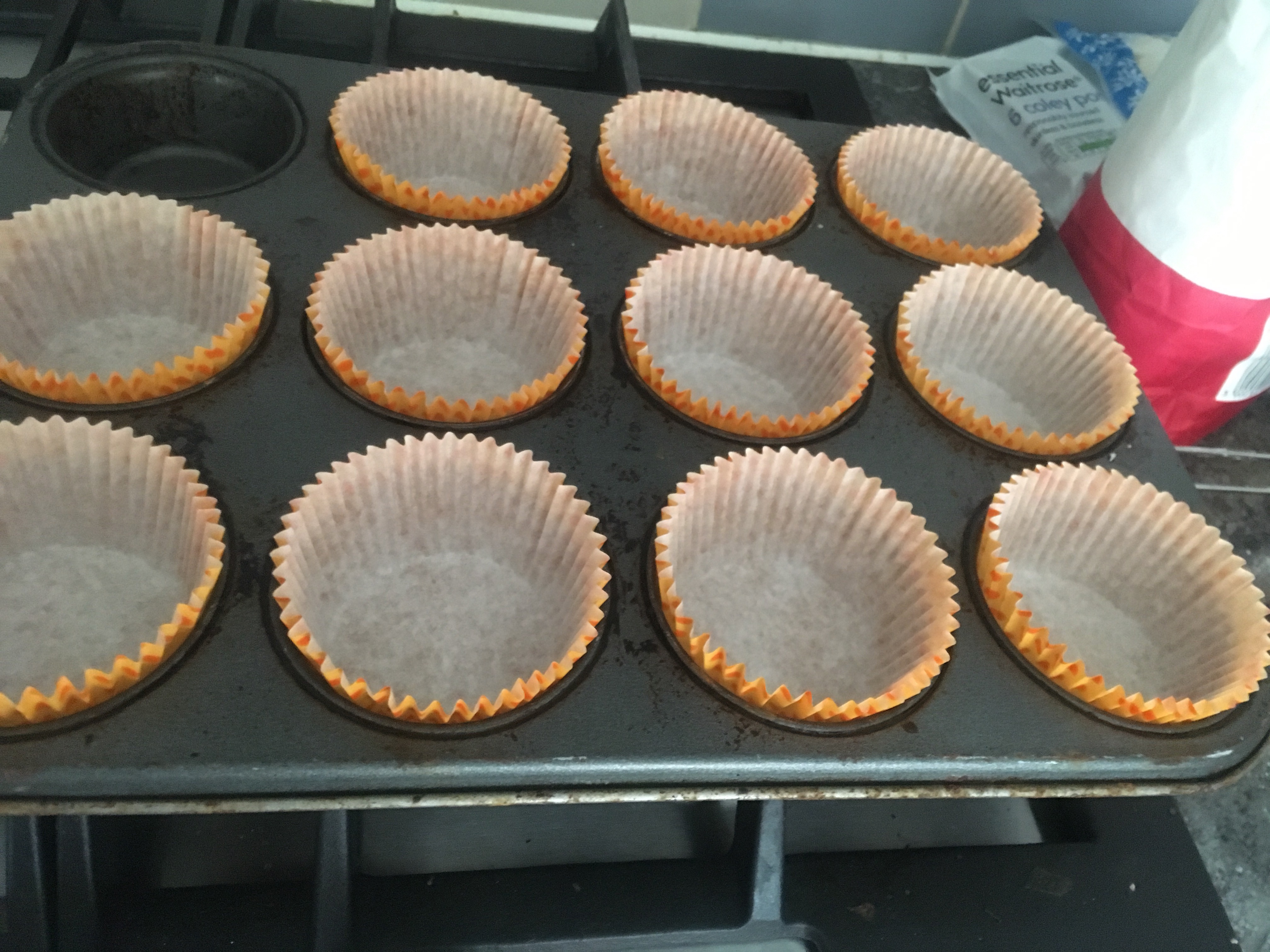 Pre heat oven 190 degree celcius fan assisted. Lined 12 cupcake paper onto the muffin tin. If the muffin tin has a non stick coating, there is no need to grease it.