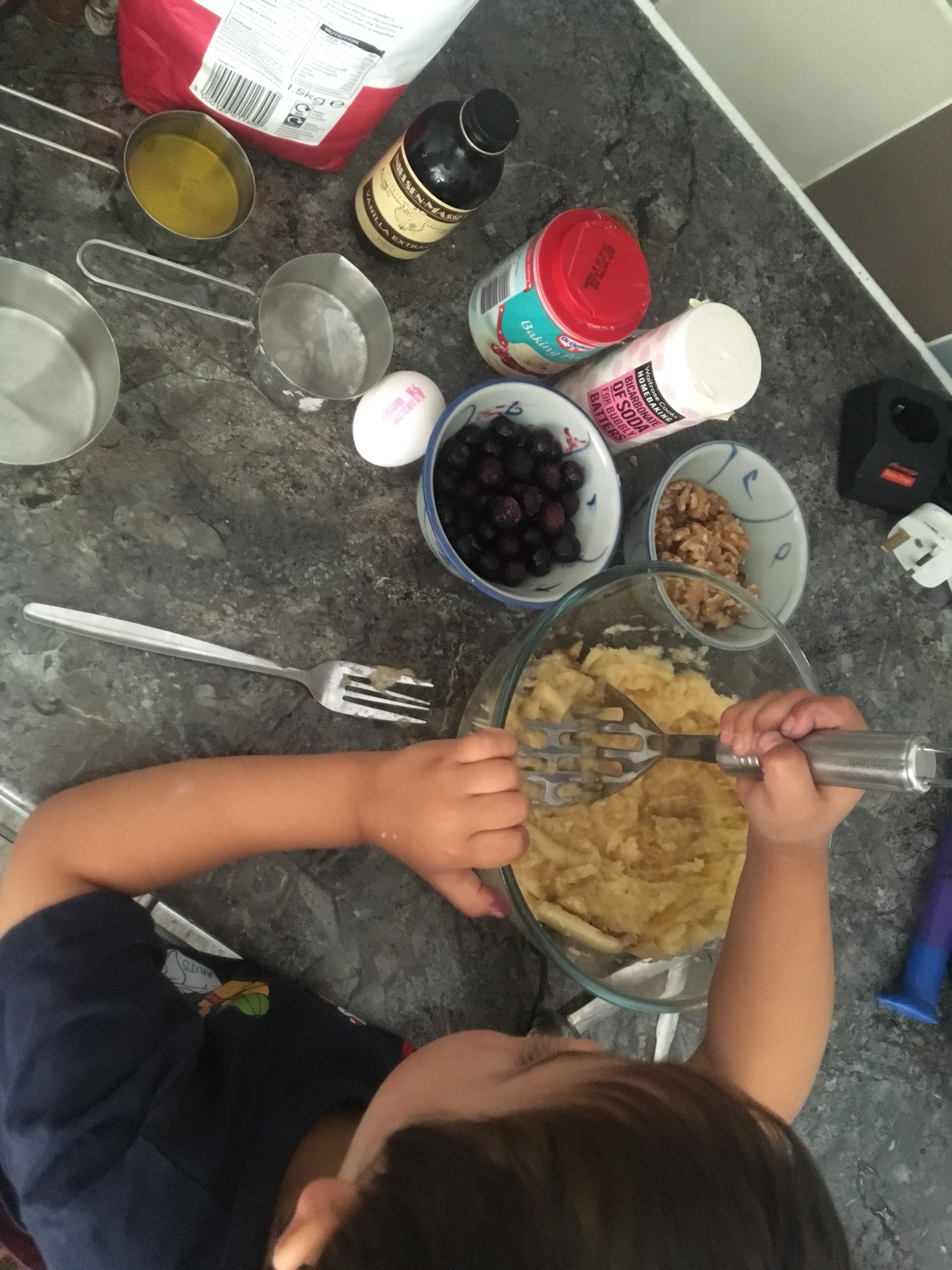 Mash the bananas using a potato masher (I find it much easier to use than using a fork). Then add grated apple, blueberries, egg and vanilla essence.