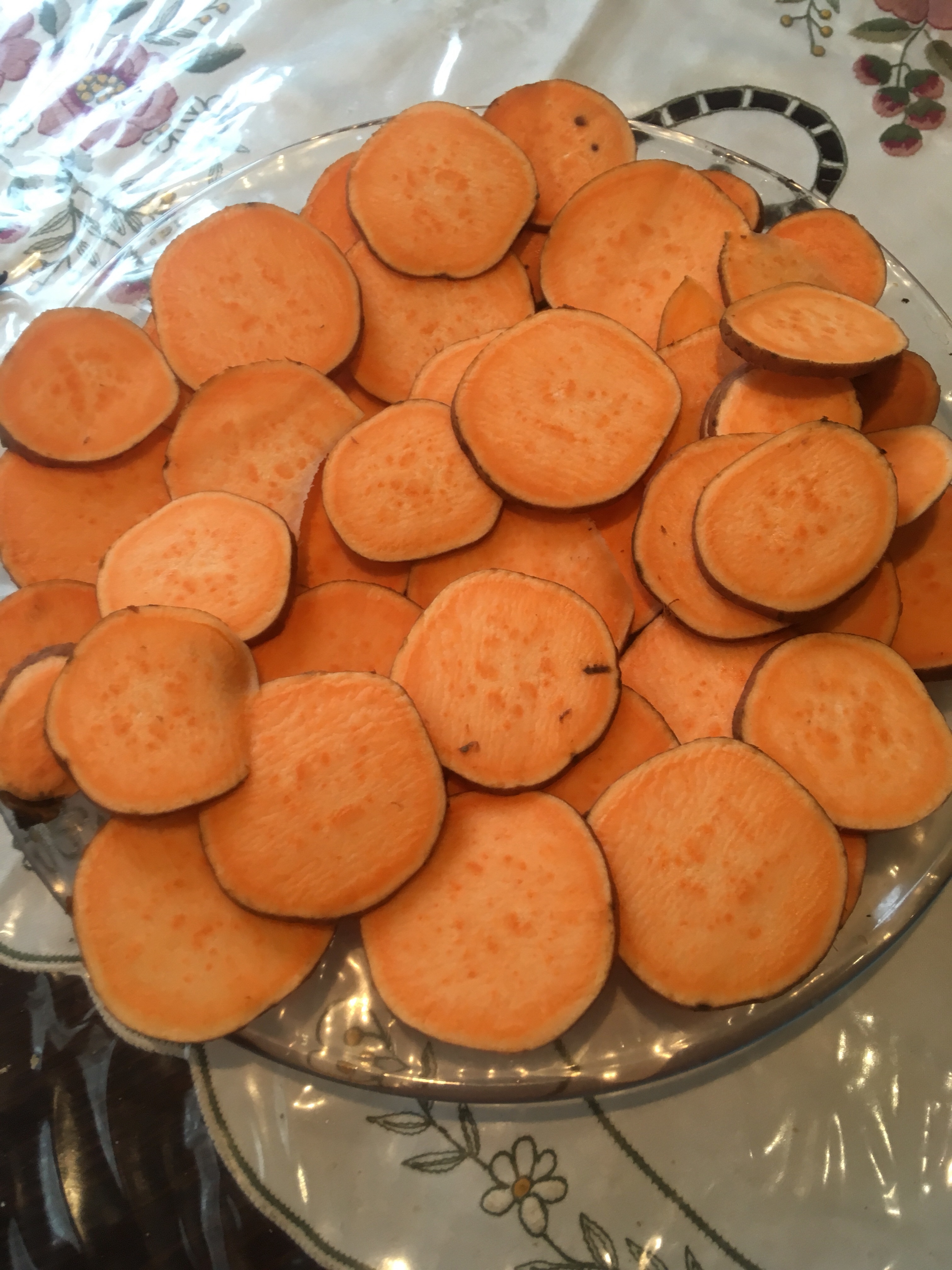 Pre heat the oven to 190 degree celcius fan assisted. Slice the sweet potato into thin slices about 2-3 mm using a kitchen knife. Spread them out thinly on a ovenproof dish I use Pyrex as they are easy to clean in the dishwasher and the flesh doesn’t tend to stick as much as the baking tray. Alternatively one can use an ovenproof non stick silicon baking mat or a grease proof baking sheet like baking parchment lay on top of a baking tray.