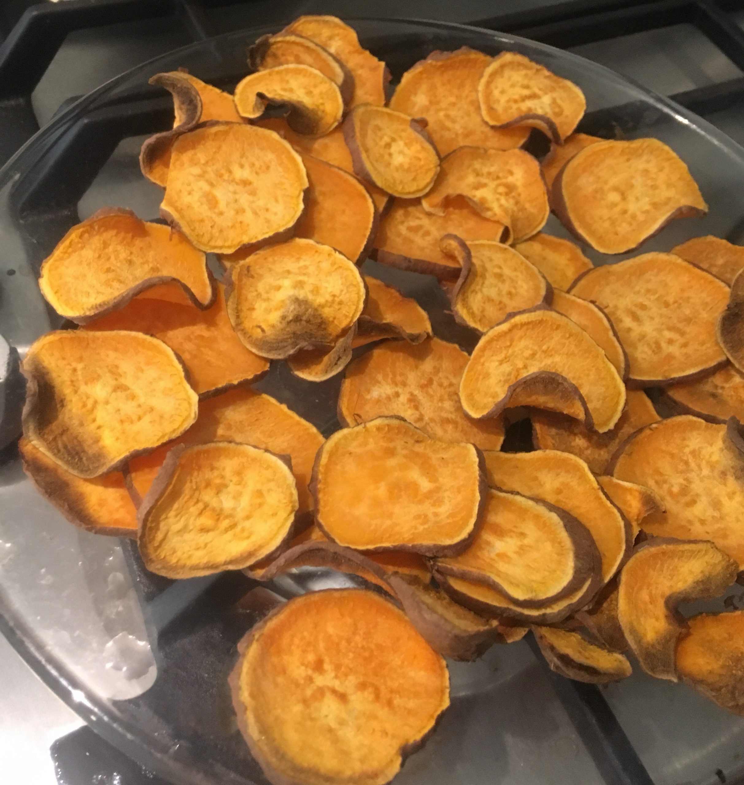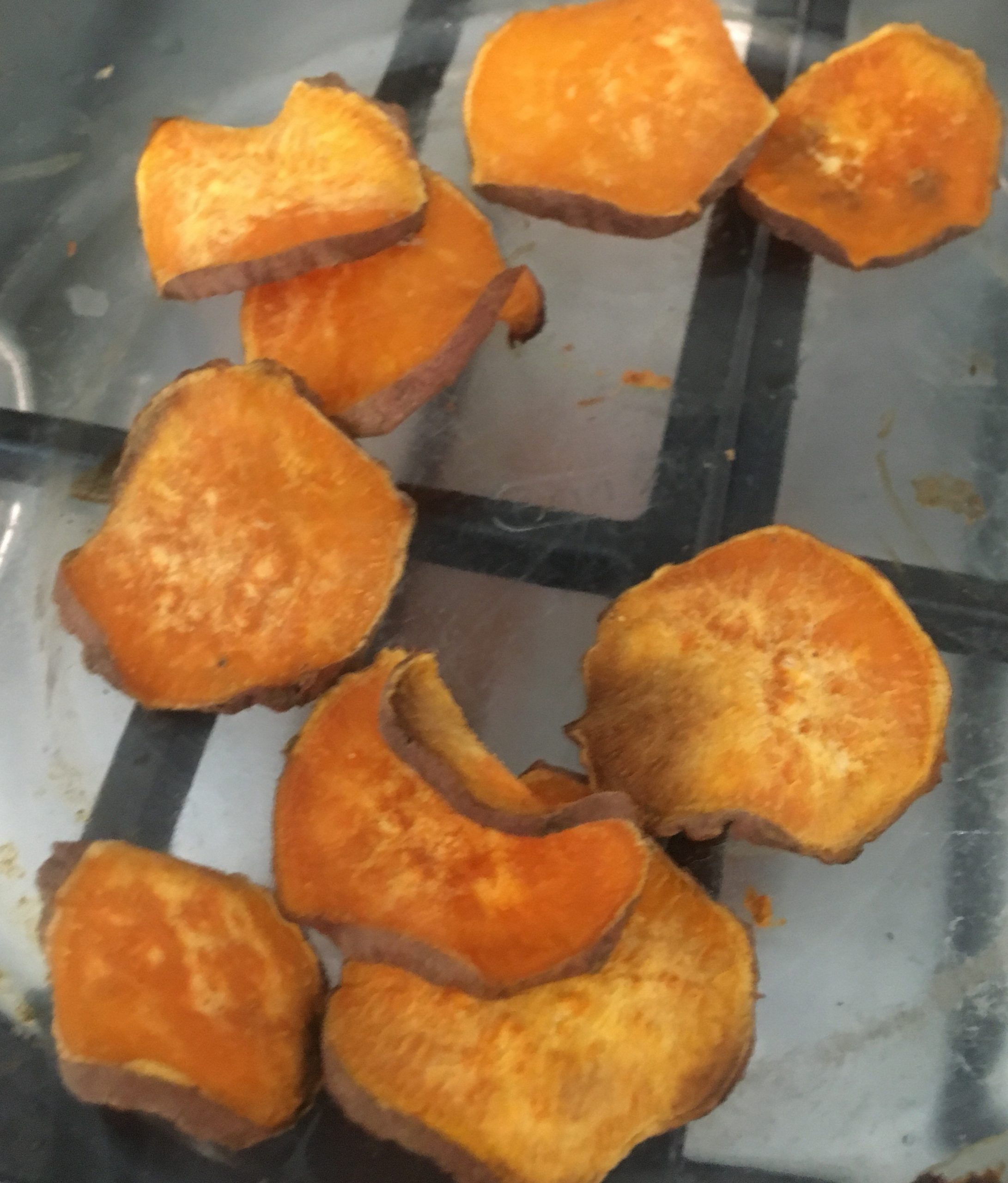 After about 20 minutes in the oven the sweet potato slices is starting to dry up. If you overlay like I did the top layer will begin to dry out. If you see it is starting to go brown take them out as this is sign of the sugar in the sweet potato caramelising. It will have a slight bitter after taste as it has got the skin on. If you see a soft sweet potato it is cooked but not at drying out stage yet. Before it turns brown while drying out it will have a white-ish dry ‘thinge’. For it to crisp up the sliced sweet potato has be a bit brownish and and white thinge stage. another tip to watch is they are slowly curling up into crisps.